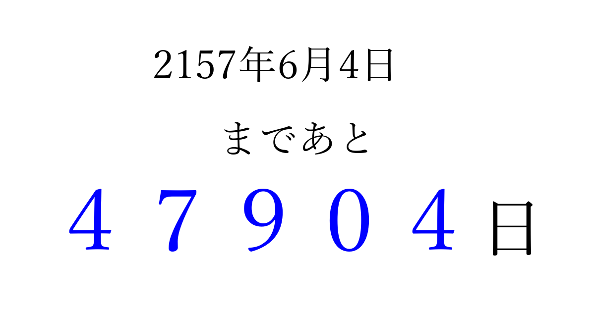 2157年6月4日(土)まで あと 99999 日です 追加すると、トップページからすぐ選べるようになります ※2026/04/08現在の結果です。 最新の状態に更新する ↓シェアして、タイムライン上にカウントダウンを表示しよう!↓ 📤 この結果を共有する Tweet シェア Threads Bluesky 別の日付でカウントダウン 2157年6月のカレンダー このページをブックマークに追加すると、いつでもカウントダウンを確認できます。 (PC: Ctrl+D / Mac: ⌘+D) hitome-notes.comでは以下のページも運営しています。 指定日と期間から日付を計算 | ガチャ確率計算・シミュレーション | プライバシー・ポリシー 運営者:Avocado