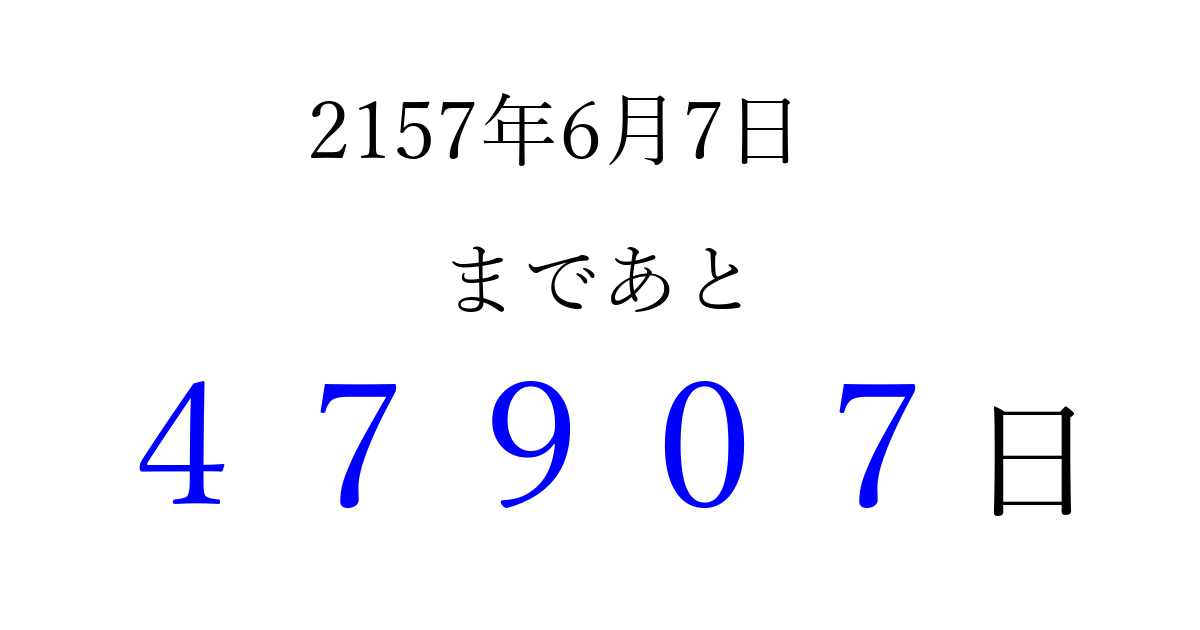 2157年6月7日(火)まで あと 99999 日です 追加すると、トップページからすぐ選べるようになります ※2026/04/08現在の結果です。 最新の状態に更新する ↓シェアして、タイムライン上にカウントダウンを表示しよう!↓ 📤 この結果を共有する Tweet シェア Threads Bluesky 別の日付でカウントダウン 2157年6月のカレンダー このページをブックマークに追加すると、いつでもカウントダウンを確認できます。 (PC: Ctrl+D / Mac: ⌘+D) hitome-notes.comでは以下のページも運営しています。 指定日と期間から日付を計算 | ガチャ確率計算・シミュレーション | プライバシー・ポリシー 運営者:Avocado