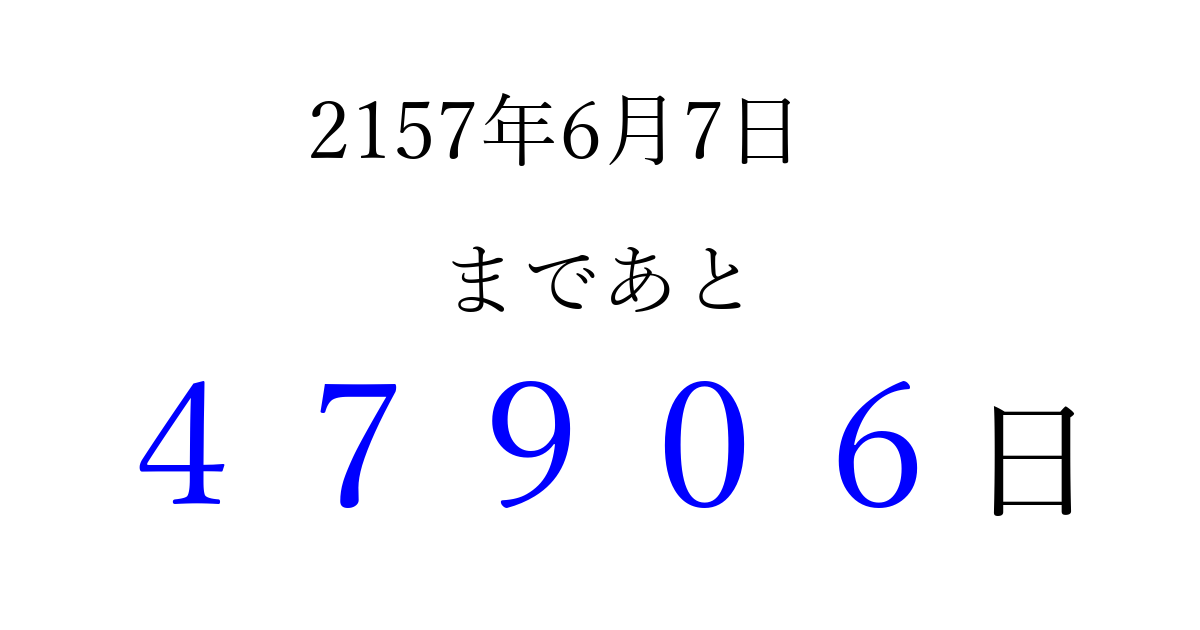2157年6月7日(火)まで あと 99999 日です 追加すると、トップページからすぐ選べるようになります ※2026/04/09現在の結果です。 最新の状態に更新する ↓シェアして、タイムライン上にカウントダウンを表示しよう!↓ 📤 この結果を共有する Tweet シェア Threads Bluesky 別の日付でカウントダウン 2157年6月のカレンダー このページをブックマークに追加すると、いつでもカウントダウンを確認できます。 (PC: Ctrl+D / Mac: ⌘+D) hitome-notes.comでは以下のページも運営しています。 指定日と期間から日付を計算 | ガチャ確率計算・シミュレーション | プライバシー・ポリシー 運営者:Avocado