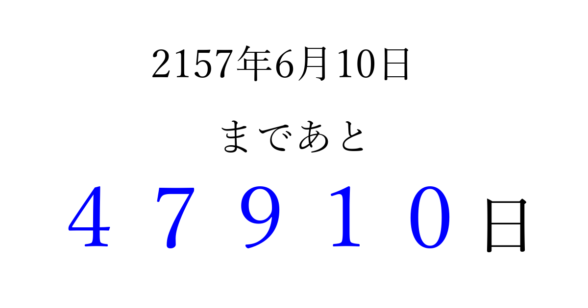 2157年6月10日(金)まで あと 99999 日です 追加すると、トップページからすぐ選べるようになります ※2026/04/08現在の結果です。 最新の状態に更新する ↓シェアして、タイムライン上にカウントダウンを表示しよう!↓ 📤 この結果を共有する Tweet シェア Threads Bluesky 別の日付でカウントダウン 2157年6月のカレンダー このページをブックマークに追加すると、いつでもカウントダウンを確認できます。 (PC: Ctrl+D / Mac: ⌘+D) hitome-notes.comでは以下のページも運営しています。 指定日と期間から日付を計算 | ガチャ確率計算・シミュレーション | プライバシー・ポリシー 運営者:Avocado