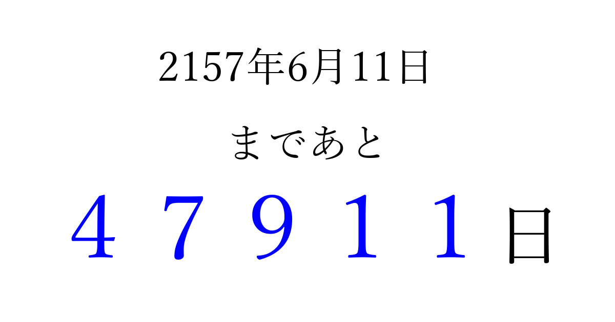 2157年6月11日(土)まで あと 99999 日です 追加すると、トップページからすぐ選べるようになります ※2026/04/08現在の結果です。 最新の状態に更新する ↓シェアして、タイムライン上にカウントダウンを表示しよう!↓ 📤 この結果を共有する Tweet シェア Threads Bluesky 別の日付でカウントダウン 2157年6月のカレンダー このページをブックマークに追加すると、いつでもカウントダウンを確認できます。 (PC: Ctrl+D / Mac: ⌘+D) hitome-notes.comでは以下のページも運営しています。 指定日と期間から日付を計算 | ガチャ確率計算・シミュレーション | プライバシー・ポリシー 運営者:Avocado
