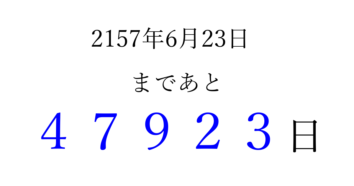 2157年6月23日(木)まで あと 99999 日です 追加すると、トップページからすぐ選べるようになります ※2026/04/08現在の結果です。 最新の状態に更新する ↓シェアして、タイムライン上にカウントダウンを表示しよう!↓ 📤 この結果を共有する Tweet シェア Threads Bluesky 別の日付でカウントダウン 2157年6月のカレンダー このページをブックマークに追加すると、いつでもカウントダウンを確認できます。 (PC: Ctrl+D / Mac: ⌘+D) hitome-notes.comでは以下のページも運営しています。 指定日と期間から日付を計算 | ガチャ確率計算・シミュレーション | プライバシー・ポリシー 運営者:Avocado