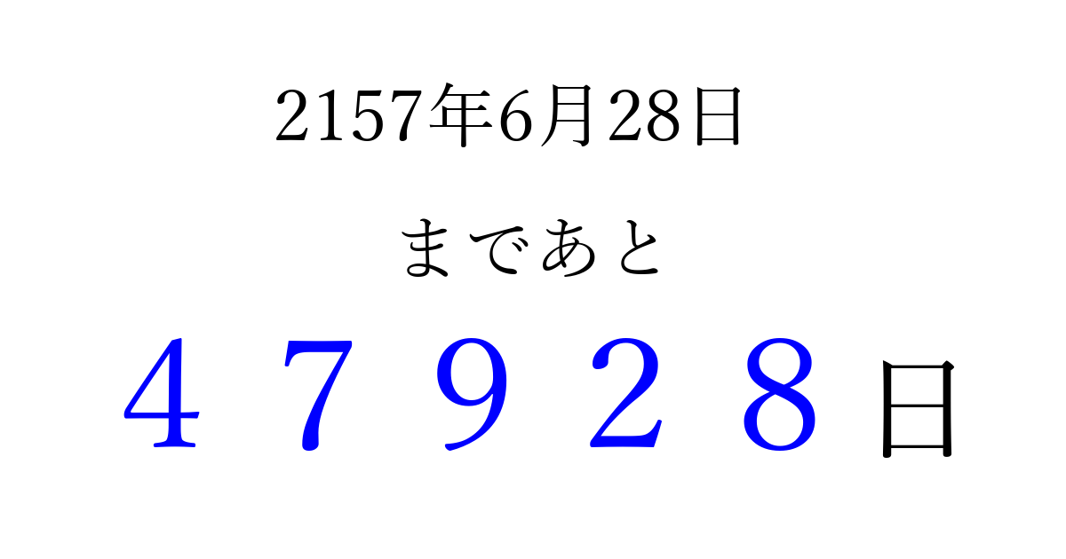 2157年6月28日(火)まで あと 99999 日です 追加すると、トップページからすぐ選べるようになります ※2026/04/08現在の結果です。 最新の状態に更新する ↓シェアして、タイムライン上にカウントダウンを表示しよう!↓ 📤 この結果を共有する Tweet シェア Threads Bluesky 別の日付でカウントダウン 2157年6月のカレンダー このページをブックマークに追加すると、いつでもカウントダウンを確認できます。 (PC: Ctrl+D / Mac: ⌘+D) hitome-notes.comでは以下のページも運営しています。 指定日と期間から日付を計算 | ガチャ確率計算・シミュレーション | プライバシー・ポリシー 運営者:Avocado
