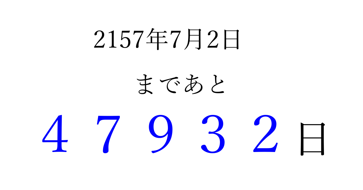 2157年7月2日(土)まで あと 99999 日です 追加すると、トップページからすぐ選べるようになります ※2026/04/08現在の結果です。 最新の状態に更新する ↓シェアして、タイムライン上にカウントダウンを表示しよう!↓ 📤 この結果を共有する Tweet シェア Threads Bluesky 別の日付でカウントダウン 2157年7月のカレンダー このページをブックマークに追加すると、いつでもカウントダウンを確認できます。 (PC: Ctrl+D / Mac: ⌘+D) hitome-notes.comでは以下のページも運営しています。 指定日と期間から日付を計算 | ガチャ確率計算・シミュレーション | プライバシー・ポリシー 運営者:Avocado