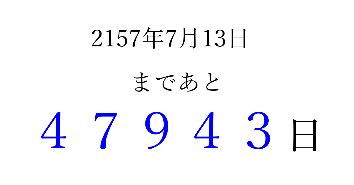 2157年7月13日(水)まで あと 99999 日です 追加すると、トップページからすぐ選べるようになります ※2026/04/08現在の結果です。 最新の状態に更新する ↓シェアして、タイムライン上にカウントダウンを表示しよう!↓ 📤 この結果を共有する Tweet シェア Threads Bluesky 別の日付でカウントダウン 2157年7月のカレンダー このページをブックマークに追加すると、いつでもカウントダウンを確認できます。 (PC: Ctrl+D / Mac: ⌘+D) hitome-notes.comでは以下のページも運営しています。 指定日と期間から日付を計算 | ガチャ確率計算・シミュレーション | プライバシー・ポリシー 運営者:Avocado