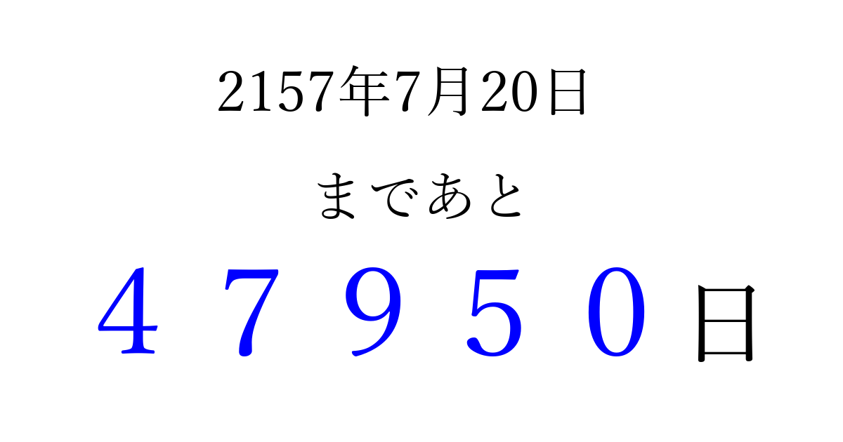 2157年7月20日(水)まで あと 99999 日です 追加すると、トップページからすぐ選べるようになります ※2026/04/08現在の結果です。 最新の状態に更新する ↓シェアして、タイムライン上にカウントダウンを表示しよう!↓ 📤 この結果を共有する Tweet シェア Threads Bluesky 別の日付でカウントダウン 2157年7月のカレンダー このページをブックマークに追加すると、いつでもカウントダウンを確認できます。 (PC: Ctrl+D / Mac: ⌘+D) hitome-notes.comでは以下のページも運営しています。 指定日と期間から日付を計算 | ガチャ確率計算・シミュレーション | プライバシー・ポリシー 運営者:Avocado