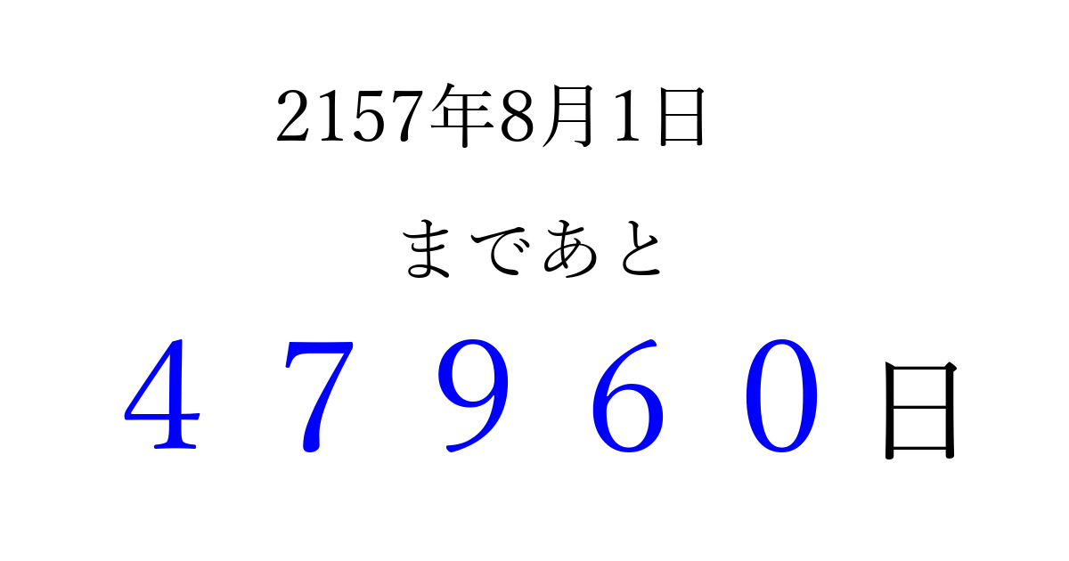 2157年8月1日(月)まで あと 99999 日です 追加すると、トップページからすぐ選べるようになります ※2026/04/10現在の結果です。 最新の状態に更新する ↓シェアして、タイムライン上にカウントダウンを表示しよう!↓ 📤 この結果を共有する Tweet シェア Threads Bluesky 別の日付でカウントダウン 2157年8月のカレンダー このページをブックマークに追加すると、いつでもカウントダウンを確認できます。 (PC: Ctrl+D / Mac: ⌘+D) hitome-notes.comでは以下のページも運営しています。 指定日と期間から日付を計算 | ガチャ確率計算・シミュレーション | プライバシー・ポリシー 運営者:Avocado
