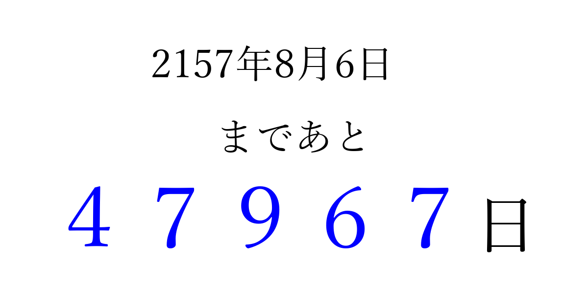 2157年8月6日(土)まで あと 99999 日です 追加すると、トップページからすぐ選べるようになります ※2026/04/08現在の結果です。 最新の状態に更新する ↓シェアして、タイムライン上にカウントダウンを表示しよう!↓ 📤 この結果を共有する Tweet シェア Threads Bluesky 別の日付でカウントダウン 2157年8月のカレンダー このページをブックマークに追加すると、いつでもカウントダウンを確認できます。 (PC: Ctrl+D / Mac: ⌘+D) hitome-notes.comでは以下のページも運営しています。 指定日と期間から日付を計算 | ガチャ確率計算・シミュレーション | プライバシー・ポリシー 運営者:Avocado