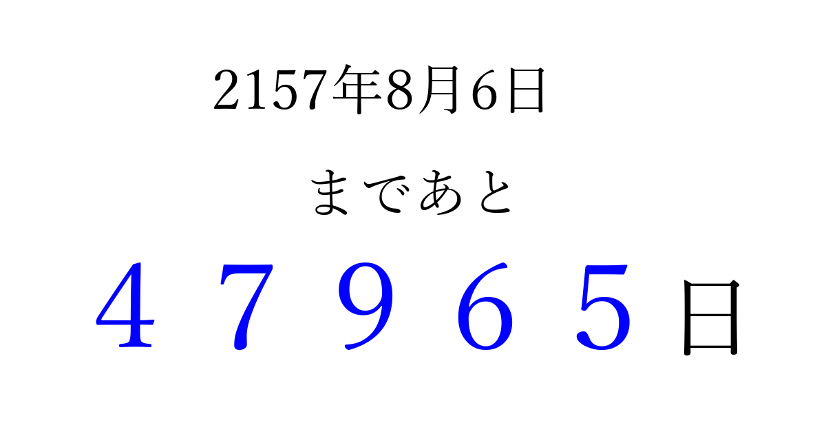 2157年8月6日(土)まで あと 99999 日です 追加すると、トップページからすぐ選べるようになります ※2026/04/10現在の結果です。 最新の状態に更新する ↓シェアして、タイムライン上にカウントダウンを表示しよう!↓ 📤 この結果を共有する Tweet シェア Threads Bluesky 別の日付でカウントダウン 2157年8月のカレンダー このページをブックマークに追加すると、いつでもカウントダウンを確認できます。 (PC: Ctrl+D / Mac: ⌘+D) hitome-notes.comでは以下のページも運営しています。 指定日と期間から日付を計算 | ガチャ確率計算・シミュレーション | プライバシー・ポリシー 運営者:Avocado