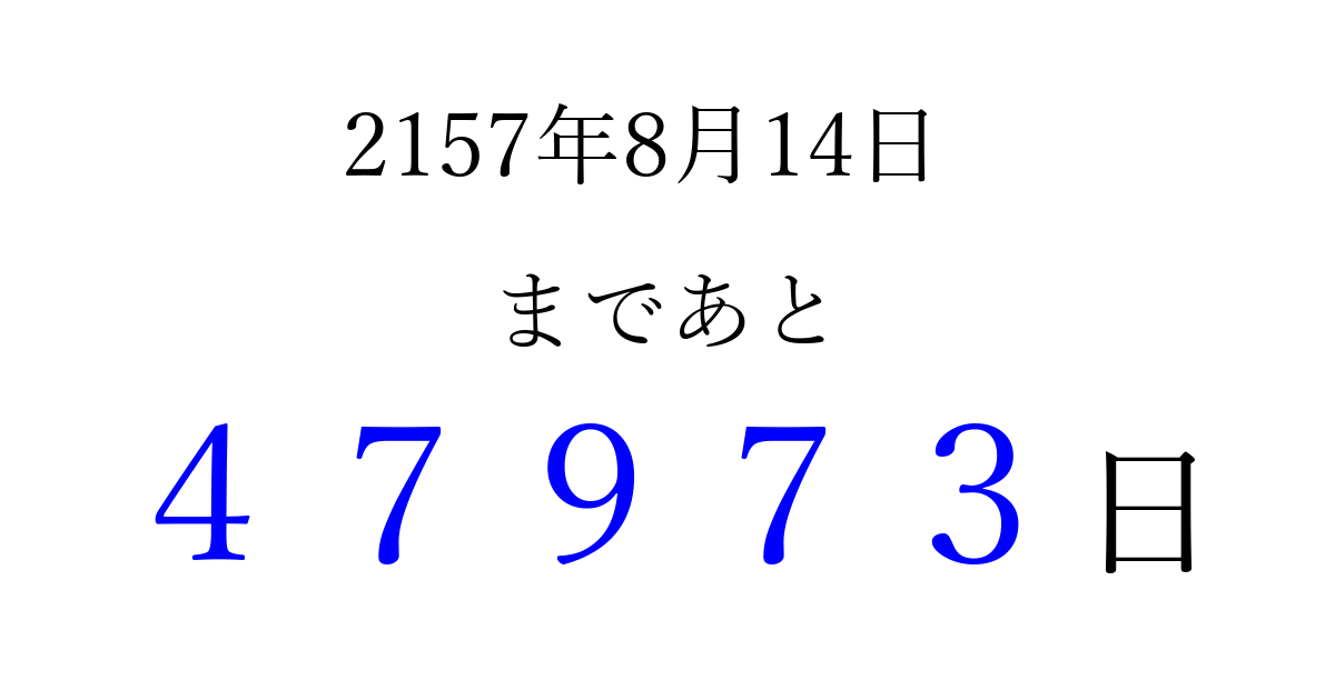 2157年8月14日(日)まで あと 99999 日です 追加すると、トップページからすぐ選べるようになります ※2026/04/10現在の結果です。 最新の状態に更新する ↓シェアして、タイムライン上にカウントダウンを表示しよう!↓ 📤 この結果を共有する Tweet シェア Threads Bluesky 別の日付でカウントダウン 2157年8月のカレンダー このページをブックマークに追加すると、いつでもカウントダウンを確認できます。 (PC: Ctrl+D / Mac: ⌘+D) hitome-notes.comでは以下のページも運営しています。 指定日と期間から日付を計算 | ガチャ確率計算・シミュレーション | プライバシー・ポリシー 運営者:Avocado