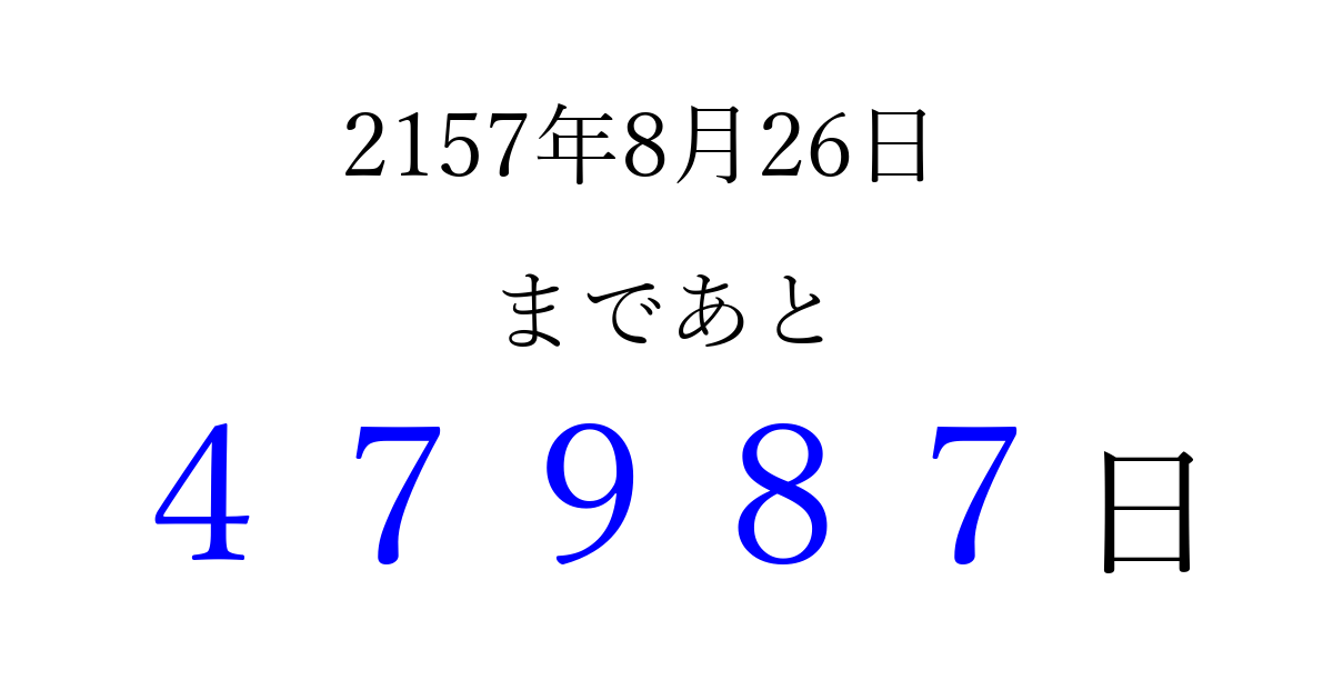 2157年8月26日(金)まで あと 99999 日です 追加すると、トップページからすぐ選べるようになります ※2026/04/08現在の結果です。 最新の状態に更新する ↓シェアして、タイムライン上にカウントダウンを表示しよう!↓ 📤 この結果を共有する Tweet シェア Threads Bluesky 別の日付でカウントダウン 2157年8月のカレンダー このページをブックマークに追加すると、いつでもカウントダウンを確認できます。 (PC: Ctrl+D / Mac: ⌘+D) hitome-notes.comでは以下のページも運営しています。 指定日と期間から日付を計算 | ガチャ確率計算・シミュレーション | プライバシー・ポリシー 運営者:Avocado