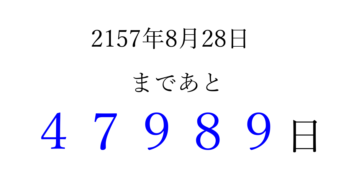 2157年8月28日(日)まで あと 99999 日です 追加すると、トップページからすぐ選べるようになります ※2026/04/08現在の結果です。 最新の状態に更新する ↓シェアして、タイムライン上にカウントダウンを表示しよう!↓ 📤 この結果を共有する Tweet シェア Threads Bluesky 別の日付でカウントダウン 2157年8月のカレンダー このページをブックマークに追加すると、いつでもカウントダウンを確認できます。 (PC: Ctrl+D / Mac: ⌘+D) hitome-notes.comでは以下のページも運営しています。 指定日と期間から日付を計算 | ガチャ確率計算・シミュレーション | プライバシー・ポリシー 運営者:Avocado