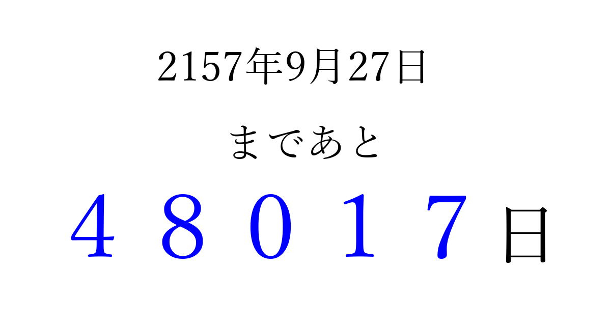 2157年9月27日(火)まで あと 99999 日です 追加すると、トップページからすぐ選べるようになります ※2026/04/10現在の結果です。 最新の状態に更新する ↓シェアして、タイムライン上にカウントダウンを表示しよう!↓ 📤 この結果を共有する Tweet シェア Threads Bluesky 別の日付でカウントダウン 2157年9月のカレンダー このページをブックマークに追加すると、いつでもカウントダウンを確認できます。 (PC: Ctrl+D / Mac: ⌘+D) hitome-notes.comでは以下のページも運営しています。 指定日と期間から日付を計算 | ガチャ確率計算・シミュレーション | プライバシー・ポリシー 運営者:Avocado