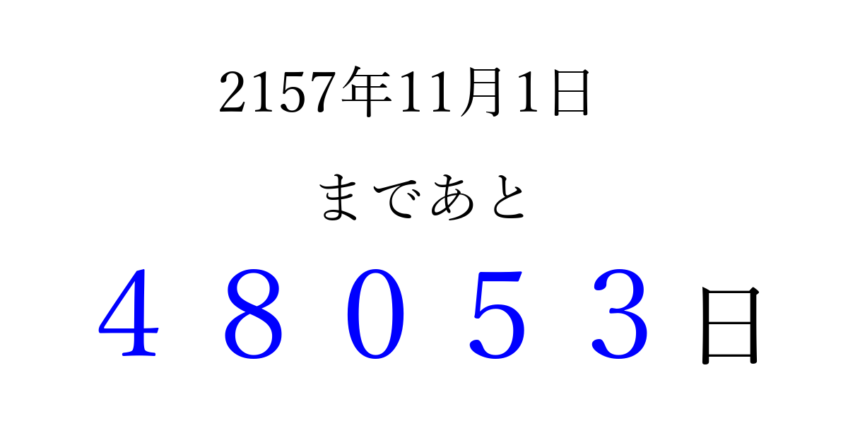 2157年11月1日(火)まで あと 99999 日です 追加すると、トップページからすぐ選べるようになります ※2026/04/09現在の結果です。 最新の状態に更新する ↓シェアして、タイムライン上にカウントダウンを表示しよう!↓ 📤 この結果を共有する Tweet シェア Threads Bluesky 別の日付でカウントダウン 2157年11月のカレンダー このページをブックマークに追加すると、いつでもカウントダウンを確認できます。 (PC: Ctrl+D / Mac: ⌘+D) hitome-notes.comでは以下のページも運営しています。 指定日と期間から日付を計算 | ガチャ確率計算・シミュレーション | プライバシー・ポリシー 運営者:Avocado