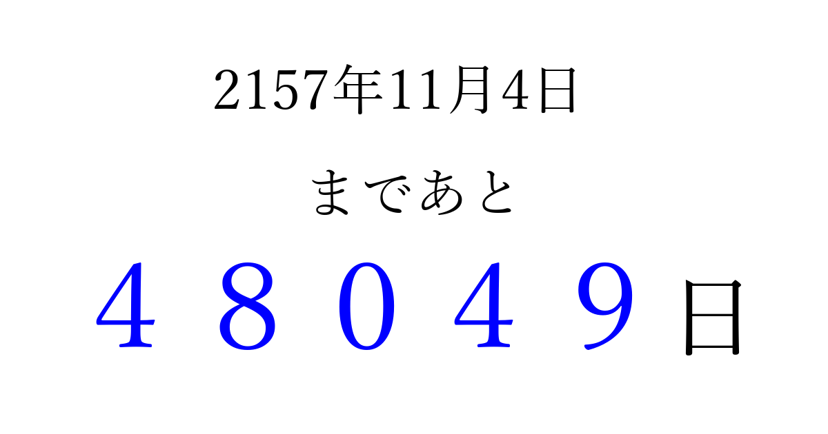 2157年11月4日(金)まで あと 99999 日です 追加すると、トップページからすぐ選べるようになります ※2026/04/16現在の結果です。 最新の状態に更新する ↓シェアして、タイムライン上にカウントダウンを表示しよう!↓ 📤 この結果を共有する Tweet シェア Threads Bluesky 別の日付でカウントダウン 2157年11月のカレンダー このページをブックマークに追加すると、いつでもカウントダウンを確認できます。 (PC: Ctrl+D / Mac: ⌘+D) hitome-notes.comでは以下のページも運営しています。 指定日と期間から日付を計算 | ガチャ確率計算・シミュレーション | プライバシー・ポリシー 運営者:Avocado
