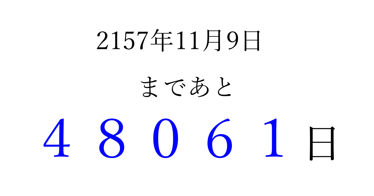 2157年11月9日(水)まで あと 99999 日です 追加すると、トップページからすぐ選べるようになります ※2026/04/09現在の結果です。 最新の状態に更新する ↓シェアして、タイムライン上にカウントダウンを表示しよう!↓ 📤 この結果を共有する Tweet シェア Threads Bluesky 別の日付でカウントダウン 2157年11月のカレンダー このページをブックマークに追加すると、いつでもカウントダウンを確認できます。 (PC: Ctrl+D / Mac: ⌘+D) hitome-notes.comでは以下のページも運営しています。 指定日と期間から日付を計算 | ガチャ確率計算・シミュレーション | プライバシー・ポリシー 運営者:Avocado