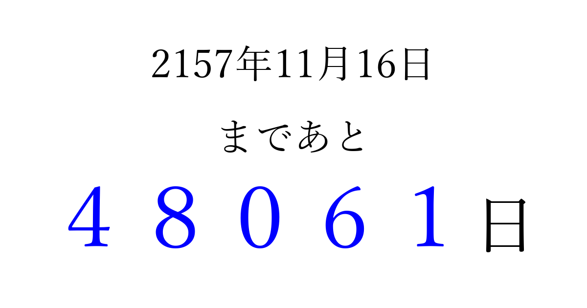 2157年11月16日(水)まで あと 99999 日です 追加すると、トップページからすぐ選べるようになります ※2026/04/16現在の結果です。 最新の状態に更新する ↓シェアして、タイムライン上にカウントダウンを表示しよう!↓ 📤 この結果を共有する Tweet シェア Threads Bluesky 別の日付でカウントダウン 2157年11月のカレンダー このページをブックマークに追加すると、いつでもカウントダウンを確認できます。 (PC: Ctrl+D / Mac: ⌘+D) hitome-notes.comでは以下のページも運営しています。 指定日と期間から日付を計算 | ガチャ確率計算・シミュレーション | プライバシー・ポリシー 運営者:Avocado