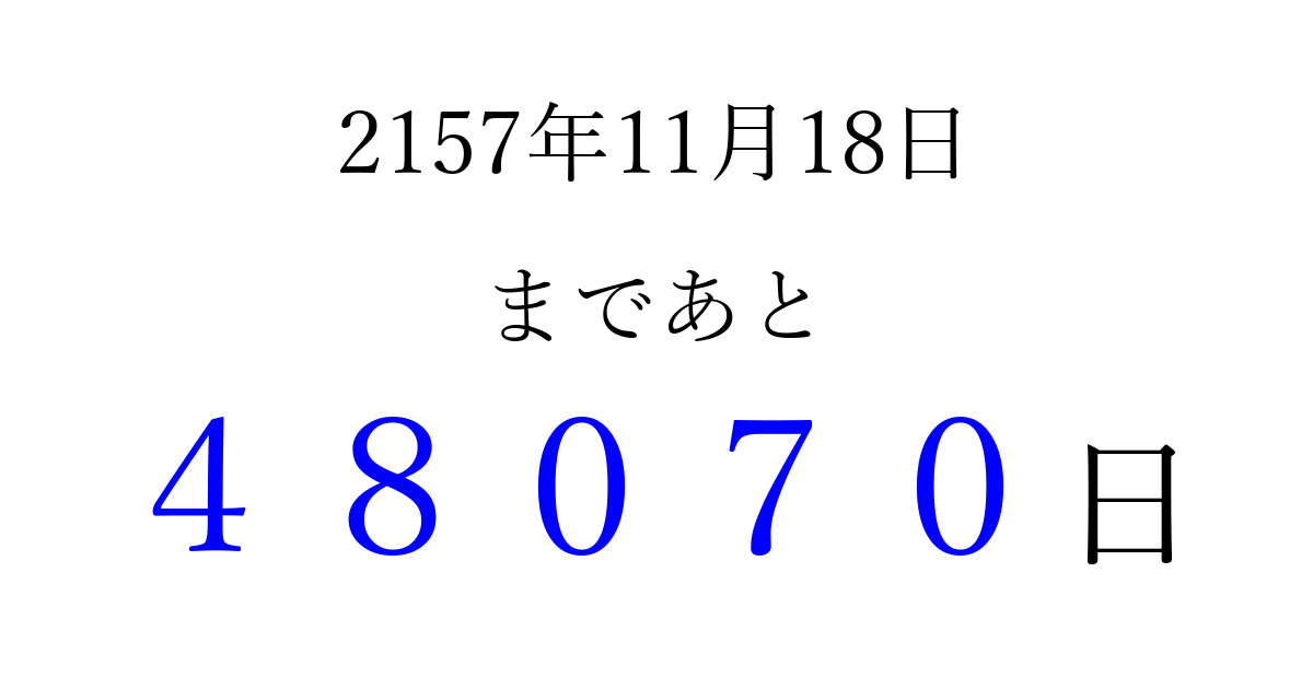 2157年11月18日(金)まで あと 99999 日です 追加すると、トップページからすぐ選べるようになります ※2026/04/09現在の結果です。 最新の状態に更新する ↓シェアして、タイムライン上にカウントダウンを表示しよう!↓ 📤 この結果を共有する Tweet シェア Threads Bluesky 別の日付でカウントダウン 2157年11月のカレンダー このページをブックマークに追加すると、いつでもカウントダウンを確認できます。 (PC: Ctrl+D / Mac: ⌘+D) hitome-notes.comでは以下のページも運営しています。 指定日と期間から日付を計算 | ガチャ確率計算・シミュレーション | プライバシー・ポリシー 運営者:Avocado