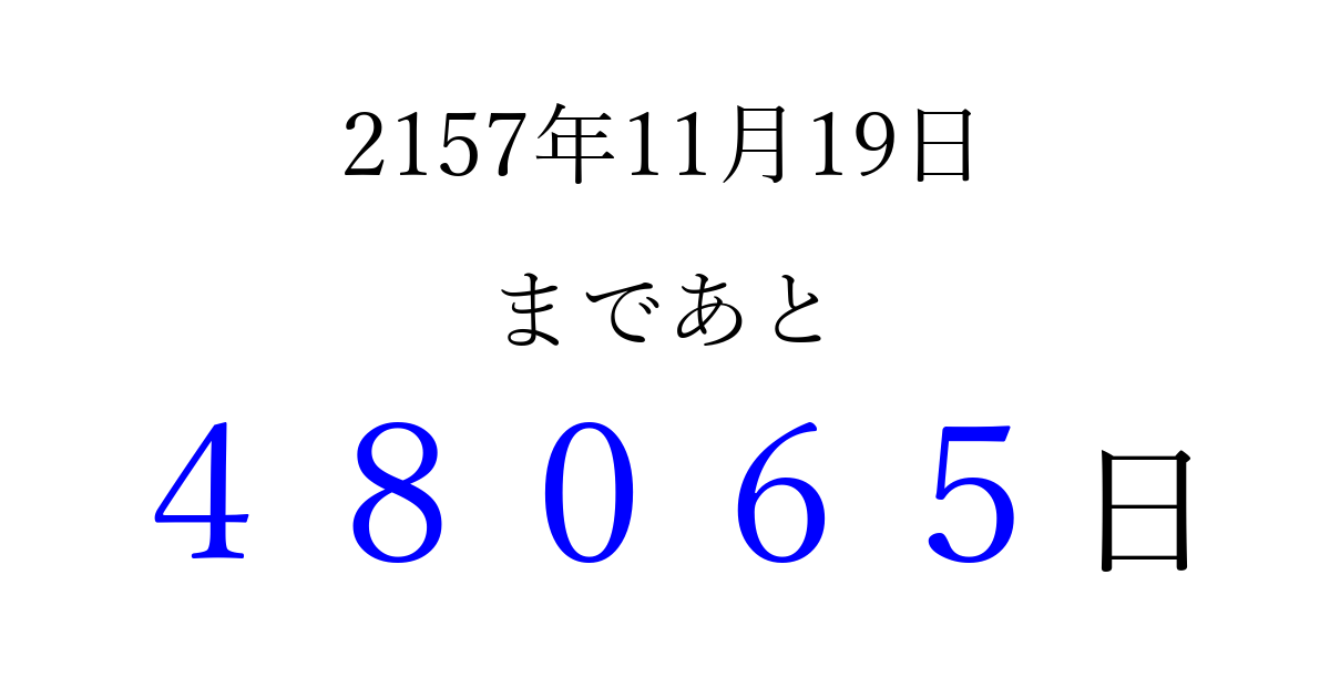 2157年11月19日(土)まで あと 99999 日です 追加すると、トップページからすぐ選べるようになります ※2026/04/15現在の結果です。 最新の状態に更新する ↓シェアして、タイムライン上にカウントダウンを表示しよう!↓ 📤 この結果を共有する Tweet シェア Threads Bluesky 別の日付でカウントダウン 2157年11月のカレンダー このページをブックマークに追加すると、いつでもカウントダウンを確認できます。 (PC: Ctrl+D / Mac: ⌘+D) hitome-notes.comでは以下のページも運営しています。 指定日と期間から日付を計算 | ガチャ確率計算・シミュレーション | プライバシー・ポリシー 運営者:Avocado