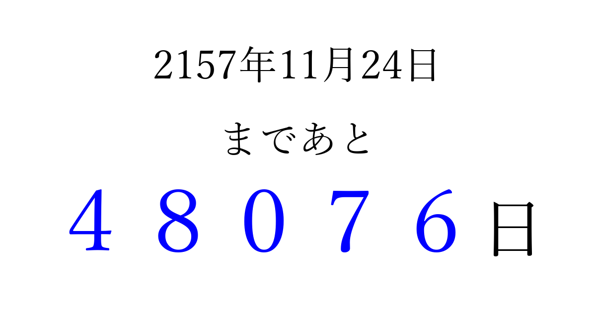 2157年11月24日(木)まで あと 99999 日です 追加すると、トップページからすぐ選べるようになります ※2026/04/09現在の結果です。 最新の状態に更新する ↓シェアして、タイムライン上にカウントダウンを表示しよう!↓ 📤 この結果を共有する Tweet シェア Threads Bluesky 別の日付でカウントダウン 2157年11月のカレンダー このページをブックマークに追加すると、いつでもカウントダウンを確認できます。 (PC: Ctrl+D / Mac: ⌘+D) hitome-notes.comでは以下のページも運営しています。 指定日と期間から日付を計算 | ガチャ確率計算・シミュレーション | プライバシー・ポリシー 運営者:Avocado