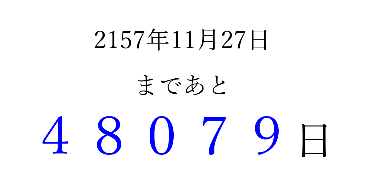 2157年11月27日(日)まで あと 99999 日です 追加すると、トップページからすぐ選べるようになります ※2026/04/09現在の結果です。 最新の状態に更新する ↓シェアして、タイムライン上にカウントダウンを表示しよう!↓ 📤 この結果を共有する Tweet シェア Threads Bluesky 別の日付でカウントダウン 2157年11月のカレンダー このページをブックマークに追加すると、いつでもカウントダウンを確認できます。 (PC: Ctrl+D / Mac: ⌘+D) hitome-notes.comでは以下のページも運営しています。 指定日と期間から日付を計算 | ガチャ確率計算・シミュレーション | プライバシー・ポリシー 運営者:Avocado