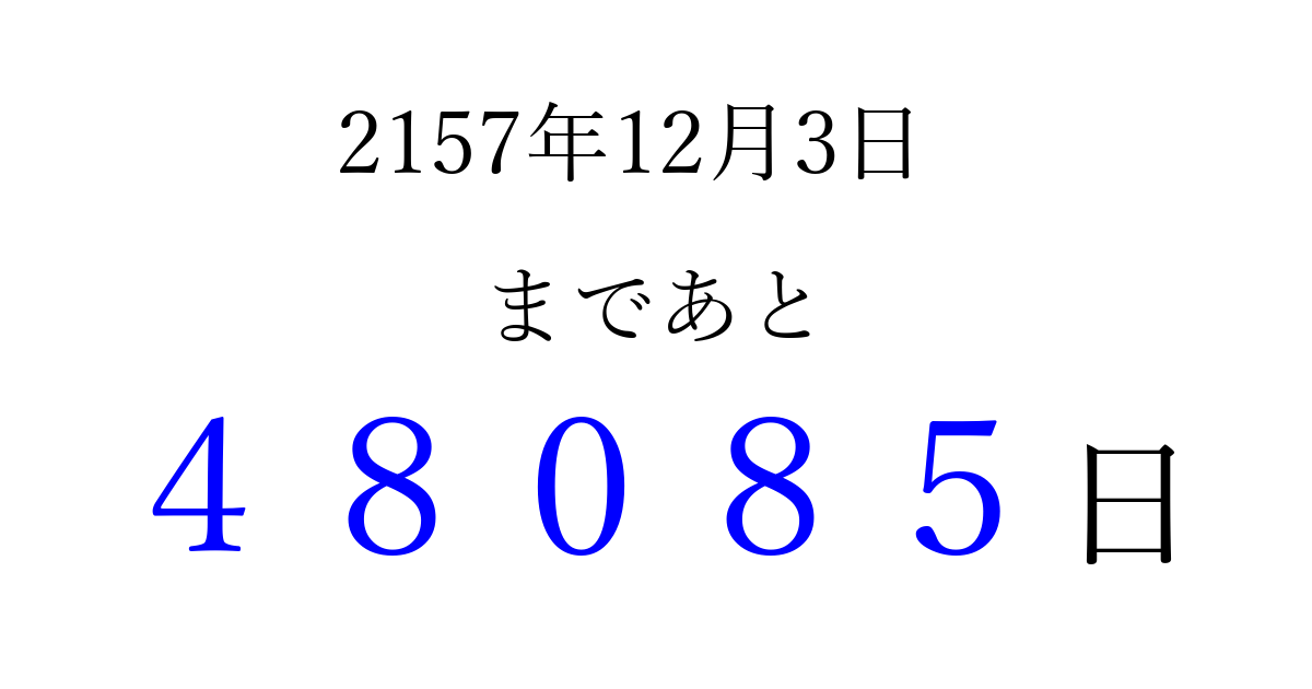 2157年12月3日(土)まで あと 99999 日です 追加すると、トップページからすぐ選べるようになります ※2026/04/09現在の結果です。 最新の状態に更新する ↓シェアして、タイムライン上にカウントダウンを表示しよう!↓ 📤 この結果を共有する Tweet シェア Threads Bluesky 別の日付でカウントダウン 2157年12月のカレンダー このページをブックマークに追加すると、いつでもカウントダウンを確認できます。 (PC: Ctrl+D / Mac: ⌘+D) hitome-notes.comでは以下のページも運営しています。 指定日と期間から日付を計算 | ガチャ確率計算・シミュレーション | プライバシー・ポリシー 運営者:Avocado