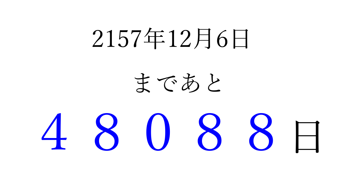 2157年12月6日(火)まで あと 99999 日です 追加すると、トップページからすぐ選べるようになります ※2026/04/09現在の結果です。 最新の状態に更新する ↓シェアして、タイムライン上にカウントダウンを表示しよう!↓ 📤 この結果を共有する Tweet シェア Threads Bluesky 別の日付でカウントダウン 2157年12月のカレンダー このページをブックマークに追加すると、いつでもカウントダウンを確認できます。 (PC: Ctrl+D / Mac: ⌘+D) hitome-notes.comでは以下のページも運営しています。 指定日と期間から日付を計算 | ガチャ確率計算・シミュレーション | プライバシー・ポリシー 運営者:Avocado