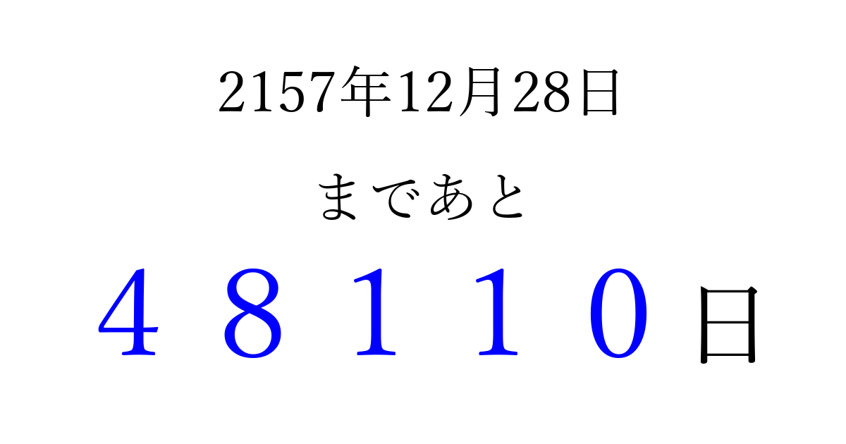 2157年12月28日(水)まで あと 99999 日です 追加すると、トップページからすぐ選べるようになります ※2026/04/09現在の結果です。 最新の状態に更新する ↓シェアして、タイムライン上にカウントダウンを表示しよう!↓ 📤 この結果を共有する Tweet シェア Threads Bluesky 別の日付でカウントダウン 2157年12月のカレンダー このページをブックマークに追加すると、いつでもカウントダウンを確認できます。 (PC: Ctrl+D / Mac: ⌘+D) hitome-notes.comでは以下のページも運営しています。 指定日と期間から日付を計算 | ガチャ確率計算・シミュレーション | プライバシー・ポリシー 運営者:Avocado