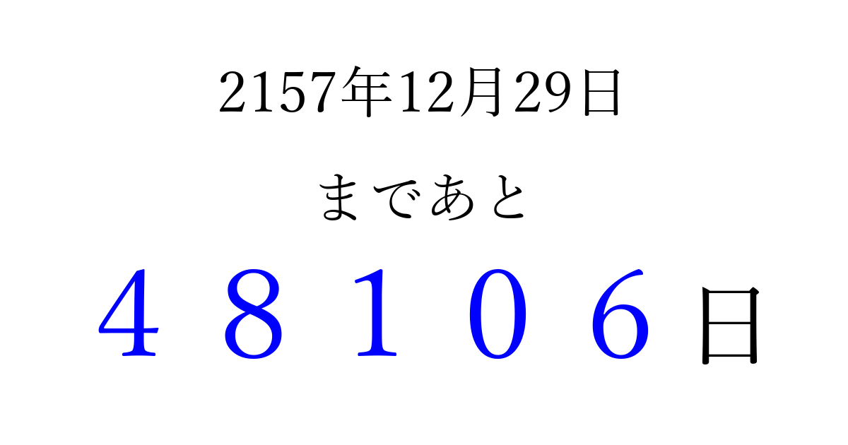 2157年12月29日(木)まで あと 99999 日です 追加すると、トップページからすぐ選べるようになります ※2026/04/14現在の結果です。 最新の状態に更新する ↓シェアして、タイムライン上にカウントダウンを表示しよう!↓ 📤 この結果を共有する Tweet シェア Threads Bluesky 別の日付でカウントダウン 2157年12月のカレンダー このページをブックマークに追加すると、いつでもカウントダウンを確認できます。 (PC: Ctrl+D / Mac: ⌘+D) hitome-notes.comでは以下のページも運営しています。 指定日と期間から日付を計算 | ガチャ確率計算・シミュレーション | プライバシー・ポリシー 運営者:Avocado