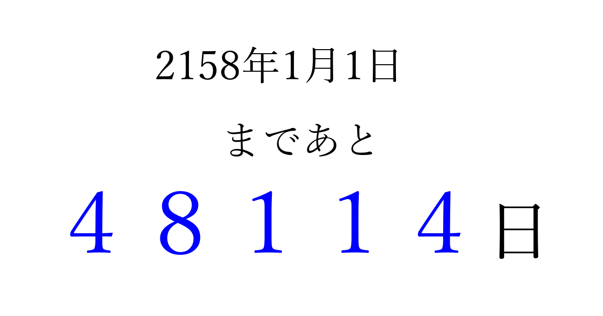 2158年1月1日(日)まで あと 99999 日です 追加すると、トップページからすぐ選べるようになります ※2026/04/09現在の結果です。 最新の状態に更新する ↓シェアして、タイムライン上にカウントダウンを表示しよう!↓ 📤 この結果を共有する Tweet シェア Threads Bluesky 別の日付でカウントダウン 2158年1月のカレンダー このページをブックマークに追加すると、いつでもカウントダウンを確認できます。 (PC: Ctrl+D / Mac: ⌘+D) hitome-notes.comでは以下のページも運営しています。 指定日と期間から日付を計算 | ガチャ確率計算・シミュレーション | プライバシー・ポリシー 運営者:Avocado