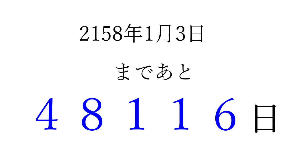 2158年1月3日(火)まで あと 99999 日です 追加すると、トップページからすぐ選べるようになります ※2026/04/09現在の結果です。 最新の状態に更新する ↓シェアして、タイムライン上にカウントダウンを表示しよう!↓ 📤 この結果を共有する Tweet シェア Threads Bluesky 別の日付でカウントダウン 2158年1月のカレンダー このページをブックマークに追加すると、いつでもカウントダウンを確認できます。 (PC: Ctrl+D / Mac: ⌘+D) hitome-notes.comでは以下のページも運営しています。 指定日と期間から日付を計算 | ガチャ確率計算・シミュレーション | プライバシー・ポリシー 運営者:Avocado