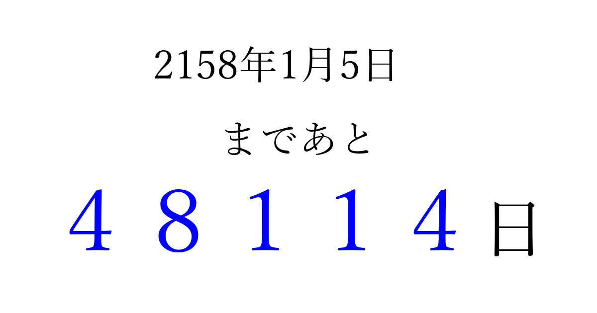 2158年1月5日(木)まで あと 99999 日です 追加すると、トップページからすぐ選べるようになります ※2026/04/13現在の結果です。 最新の状態に更新する ↓シェアして、タイムライン上にカウントダウンを表示しよう!↓ 📤 この結果を共有する Tweet シェア Threads Bluesky 別の日付でカウントダウン 2158年1月のカレンダー このページをブックマークに追加すると、いつでもカウントダウンを確認できます。 (PC: Ctrl+D / Mac: ⌘+D) hitome-notes.comでは以下のページも運営しています。 指定日と期間から日付を計算 | ガチャ確率計算・シミュレーション | プライバシー・ポリシー 運営者:Avocado