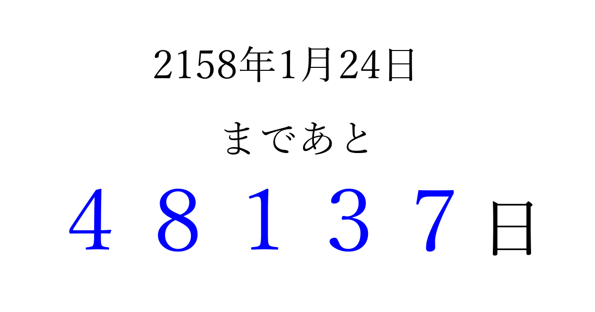 2158年1月24日(火)まで あと 99999 日です 追加すると、トップページからすぐ選べるようになります ※2026/04/09現在の結果です。 最新の状態に更新する ↓シェアして、タイムライン上にカウントダウンを表示しよう!↓ 📤 この結果を共有する Tweet シェア Threads Bluesky 別の日付でカウントダウン 2158年1月のカレンダー このページをブックマークに追加すると、いつでもカウントダウンを確認できます。 (PC: Ctrl+D / Mac: ⌘+D) hitome-notes.comでは以下のページも運営しています。 指定日と期間から日付を計算 | ガチャ確率計算・シミュレーション | プライバシー・ポリシー 運営者:Avocado