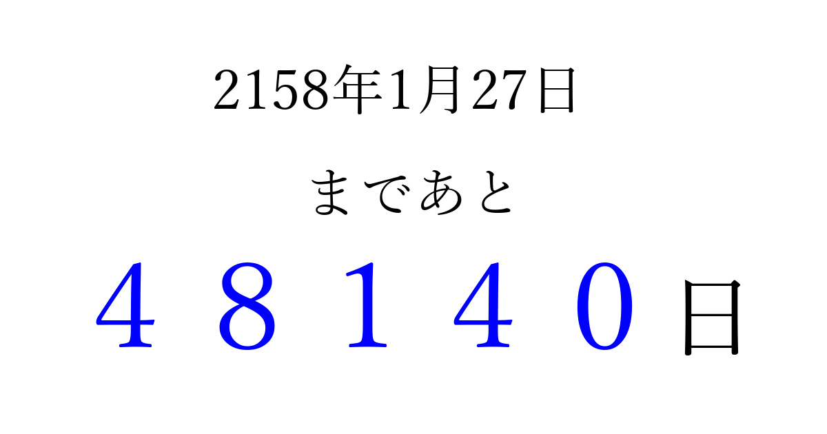 2158年1月27日(金)まで あと 99999 日です 追加すると、トップページからすぐ選べるようになります ※2026/04/09現在の結果です。 最新の状態に更新する ↓シェアして、タイムライン上にカウントダウンを表示しよう!↓ 📤 この結果を共有する Tweet シェア Threads Bluesky 別の日付でカウントダウン 2158年1月のカレンダー このページをブックマークに追加すると、いつでもカウントダウンを確認できます。 (PC: Ctrl+D / Mac: ⌘+D) hitome-notes.comでは以下のページも運営しています。 指定日と期間から日付を計算 | ガチャ確率計算・シミュレーション | プライバシー・ポリシー 運営者:Avocado