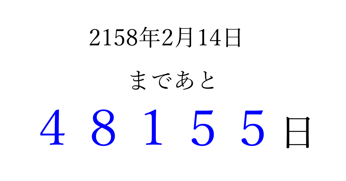 2158年2月14日(火)まで あと 99999 日です 追加すると、トップページからすぐ選べるようになります ※2026/04/12現在の結果です。 最新の状態に更新する ↓シェアして、タイムライン上にカウントダウンを表示しよう!↓ 📤 この結果を共有する Tweet シェア Threads Bluesky 別の日付でカウントダウン 2158年2月のカレンダー このページをブックマークに追加すると、いつでもカウントダウンを確認できます。 (PC: Ctrl+D / Mac: ⌘+D) hitome-notes.comでは以下のページも運営しています。 指定日と期間から日付を計算 | ガチャ確率計算・シミュレーション | プライバシー・ポリシー 運営者:Avocado