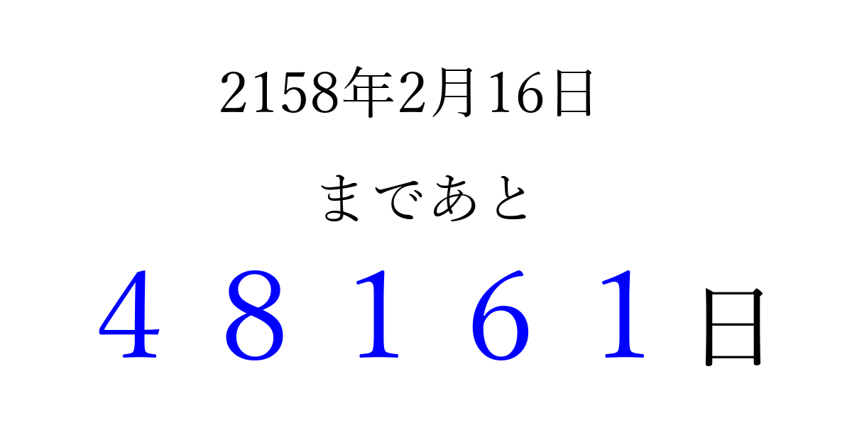 2158年2月16日(木)まで あと 99999 日です 追加すると、トップページからすぐ選べるようになります ※2026/04/08現在の結果です。 最新の状態に更新する ↓シェアして、タイムライン上にカウントダウンを表示しよう!↓ 📤 この結果を共有する Tweet シェア Threads Bluesky 別の日付でカウントダウン 2158年2月のカレンダー このページをブックマークに追加すると、いつでもカウントダウンを確認できます。 (PC: Ctrl+D / Mac: ⌘+D) hitome-notes.comでは以下のページも運営しています。 指定日と期間から日付を計算 | ガチャ確率計算・シミュレーション | プライバシー・ポリシー 運営者:Avocado