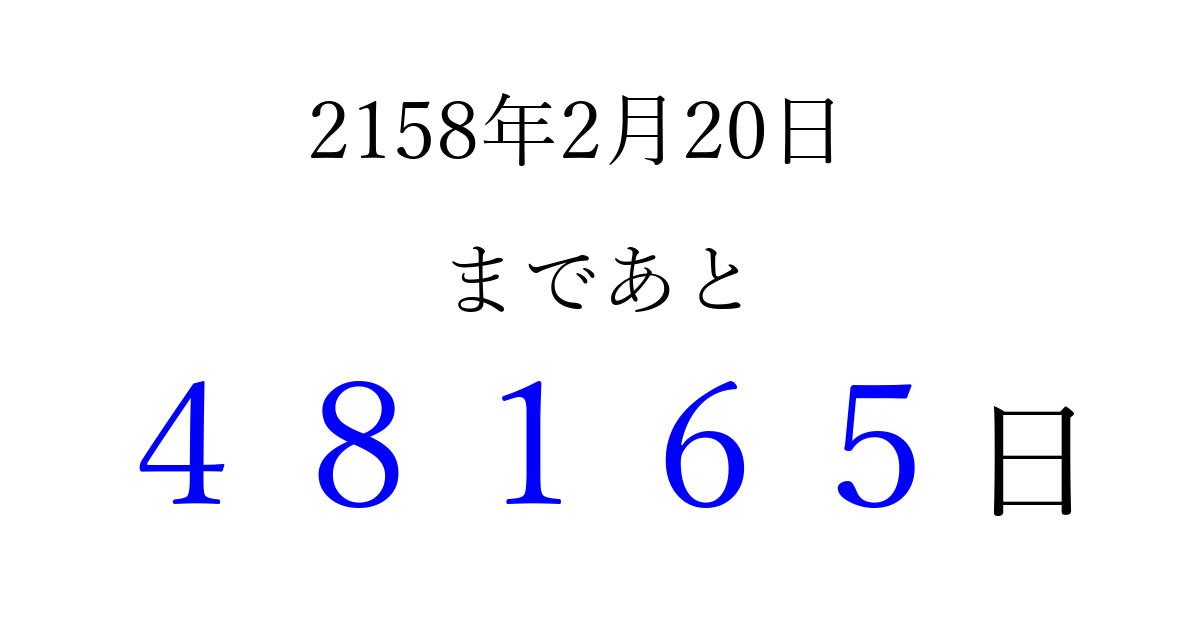 2158年2月20日(月)まで あと 99999 日です 追加すると、トップページからすぐ選べるようになります ※2026/04/08現在の結果です。 最新の状態に更新する ↓シェアして、タイムライン上にカウントダウンを表示しよう!↓ 📤 この結果を共有する Tweet シェア Threads Bluesky 別の日付でカウントダウン 2158年2月のカレンダー このページをブックマークに追加すると、いつでもカウントダウンを確認できます。 (PC: Ctrl+D / Mac: ⌘+D) hitome-notes.comでは以下のページも運営しています。 指定日と期間から日付を計算 | ガチャ確率計算・シミュレーション | プライバシー・ポリシー 運営者:Avocado