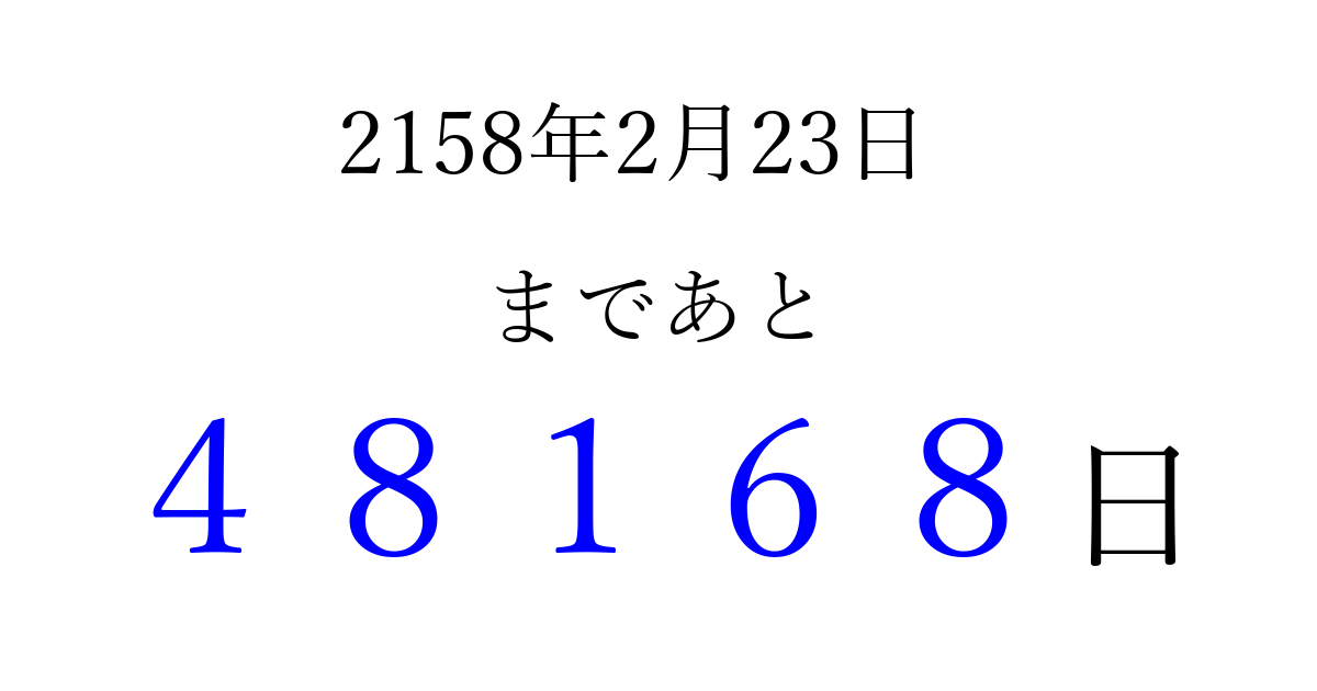 2158年2月23日(木)まで あと 99999 日です 追加すると、トップページからすぐ選べるようになります ※2026/04/08現在の結果です。 最新の状態に更新する ↓シェアして、タイムライン上にカウントダウンを表示しよう!↓ 📤 この結果を共有する Tweet シェア Threads Bluesky 別の日付でカウントダウン 2158年2月のカレンダー このページをブックマークに追加すると、いつでもカウントダウンを確認できます。 (PC: Ctrl+D / Mac: ⌘+D) hitome-notes.comでは以下のページも運営しています。 指定日と期間から日付を計算 | ガチャ確率計算・シミュレーション | プライバシー・ポリシー 運営者:Avocado