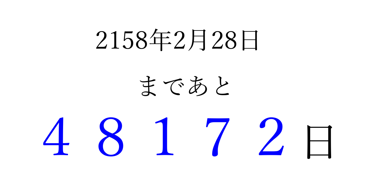 2158年2月28日(火)まで あと 99999 日です 追加すると、トップページからすぐ選べるようになります ※2026/04/09現在の結果です。 最新の状態に更新する ↓シェアして、タイムライン上にカウントダウンを表示しよう!↓ 📤 この結果を共有する Tweet シェア Threads Bluesky 別の日付でカウントダウン 2158年2月のカレンダー このページをブックマークに追加すると、いつでもカウントダウンを確認できます。 (PC: Ctrl+D / Mac: ⌘+D) hitome-notes.comでは以下のページも運営しています。 指定日と期間から日付を計算 | ガチャ確率計算・シミュレーション | プライバシー・ポリシー 運営者:Avocado