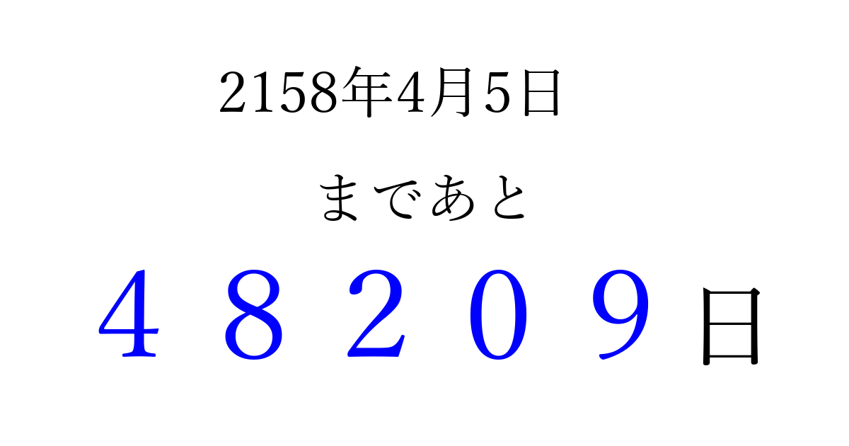 2158年4月5日(水)まで あと 99999 日です 追加すると、トップページからすぐ選べるようになります ※2026/04/08現在の結果です。 最新の状態に更新する ↓シェアして、タイムライン上にカウントダウンを表示しよう!↓ 📤 この結果を共有する Tweet シェア Threads Bluesky 別の日付でカウントダウン 2158年4月のカレンダー このページをブックマークに追加すると、いつでもカウントダウンを確認できます。 (PC: Ctrl+D / Mac: ⌘+D) hitome-notes.comでは以下のページも運営しています。 指定日と期間から日付を計算 | ガチャ確率計算・シミュレーション | プライバシー・ポリシー 運営者:Avocado