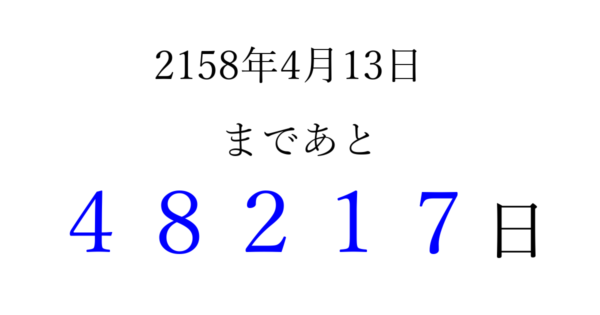 2158年4月13日(木)まで あと 99999 日です 追加すると、トップページからすぐ選べるようになります ※2026/04/08現在の結果です。 最新の状態に更新する ↓シェアして、タイムライン上にカウントダウンを表示しよう!↓ 📤 この結果を共有する Tweet シェア Threads Bluesky 別の日付でカウントダウン 2158年4月のカレンダー このページをブックマークに追加すると、いつでもカウントダウンを確認できます。 (PC: Ctrl+D / Mac: ⌘+D) hitome-notes.comでは以下のページも運営しています。 指定日と期間から日付を計算 | ガチャ確率計算・シミュレーション | プライバシー・ポリシー 運営者:Avocado