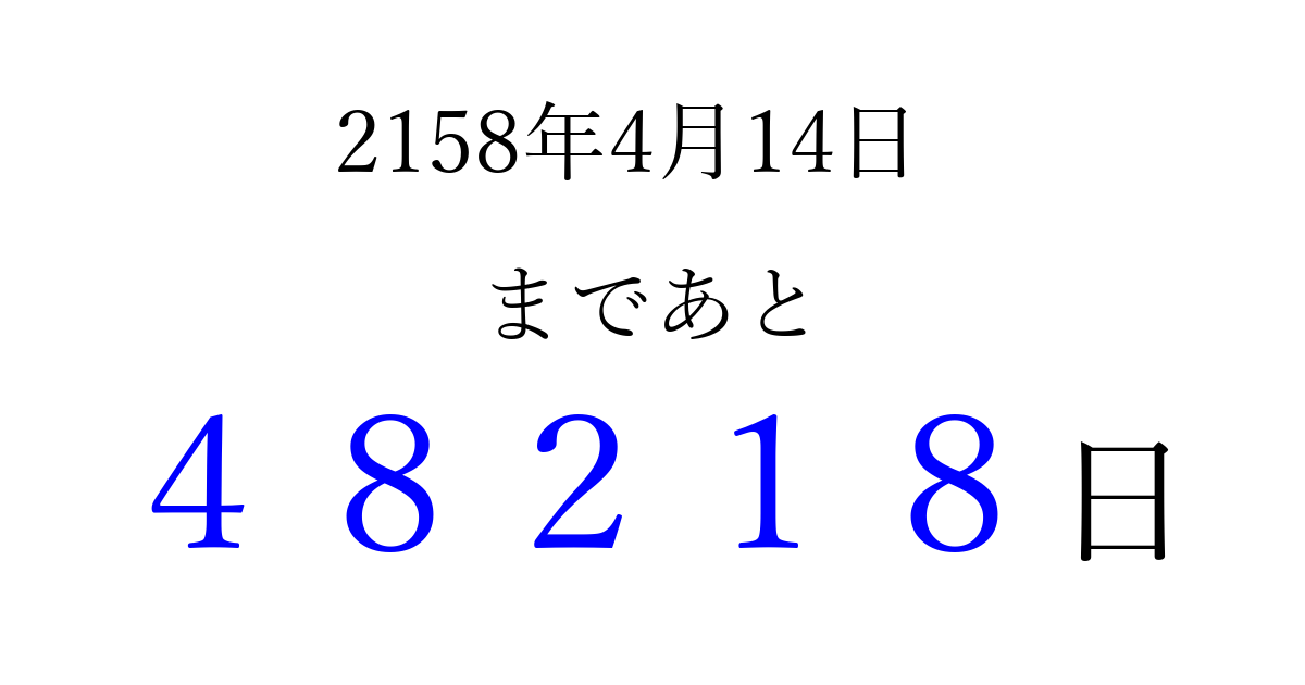 2158年4月14日(金)まで あと 99999 日です 追加すると、トップページからすぐ選べるようになります ※2026/04/08現在の結果です。 最新の状態に更新する ↓シェアして、タイムライン上にカウントダウンを表示しよう!↓ 📤 この結果を共有する Tweet シェア Threads Bluesky 別の日付でカウントダウン 2158年4月のカレンダー このページをブックマークに追加すると、いつでもカウントダウンを確認できます。 (PC: Ctrl+D / Mac: ⌘+D) hitome-notes.comでは以下のページも運営しています。 指定日と期間から日付を計算 | ガチャ確率計算・シミュレーション | プライバシー・ポリシー 運営者:Avocado