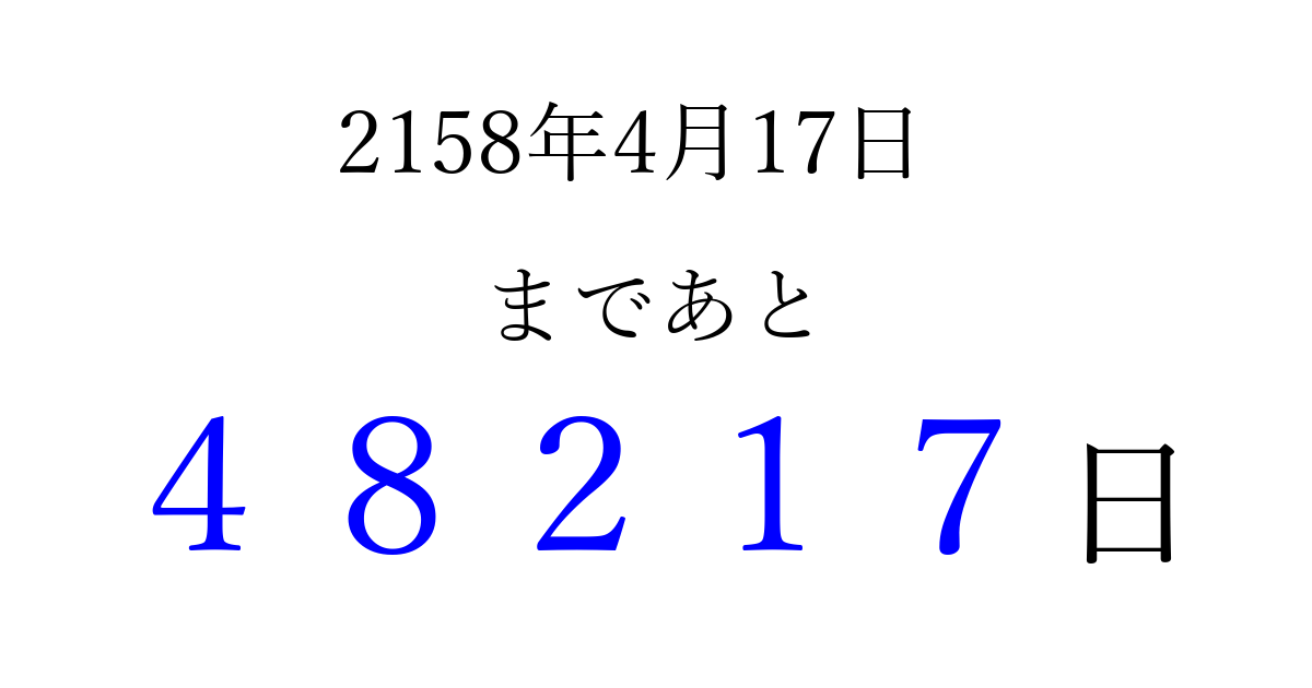 2158年4月17日(月)まで あと 99999 日です 追加すると、トップページからすぐ選べるようになります ※2026/04/12現在の結果です。 最新の状態に更新する ↓シェアして、タイムライン上にカウントダウンを表示しよう!↓ 📤 この結果を共有する Tweet シェア Threads Bluesky 別の日付でカウントダウン 2158年4月のカレンダー このページをブックマークに追加すると、いつでもカウントダウンを確認できます。 (PC: Ctrl+D / Mac: ⌘+D) hitome-notes.comでは以下のページも運営しています。 指定日と期間から日付を計算 | ガチャ確率計算・シミュレーション | プライバシー・ポリシー 運営者:Avocado