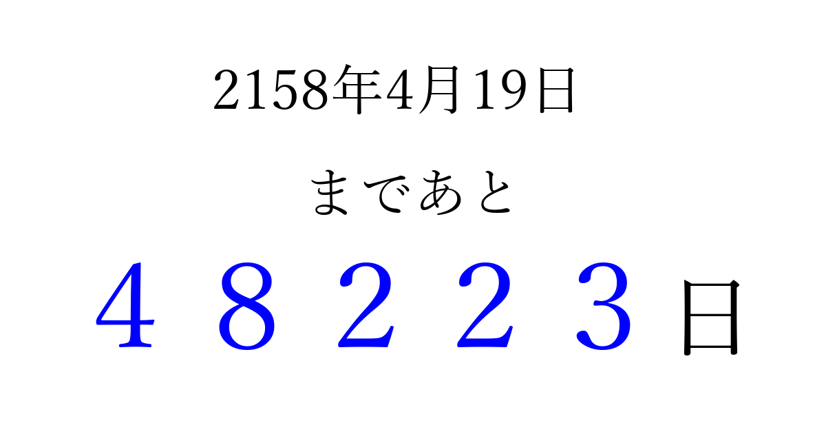 2158年4月19日(水)まで あと 99999 日です 追加すると、トップページからすぐ選べるようになります ※2026/04/08現在の結果です。 最新の状態に更新する ↓シェアして、タイムライン上にカウントダウンを表示しよう!↓ 📤 この結果を共有する Tweet シェア Threads Bluesky 別の日付でカウントダウン 2158年4月のカレンダー このページをブックマークに追加すると、いつでもカウントダウンを確認できます。 (PC: Ctrl+D / Mac: ⌘+D) hitome-notes.comでは以下のページも運営しています。 指定日と期間から日付を計算 | ガチャ確率計算・シミュレーション | プライバシー・ポリシー 運営者:Avocado