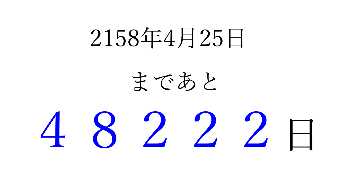 2158年4月25日(火)まで あと 99999 日です 追加すると、トップページからすぐ選べるようになります ※2026/04/15現在の結果です。 最新の状態に更新する ↓シェアして、タイムライン上にカウントダウンを表示しよう!↓ 📤 この結果を共有する Tweet シェア Threads Bluesky 別の日付でカウントダウン 2158年4月のカレンダー このページをブックマークに追加すると、いつでもカウントダウンを確認できます。 (PC: Ctrl+D / Mac: ⌘+D) hitome-notes.comでは以下のページも運営しています。 指定日と期間から日付を計算 | ガチャ確率計算・シミュレーション | プライバシー・ポリシー 運営者:Avocado