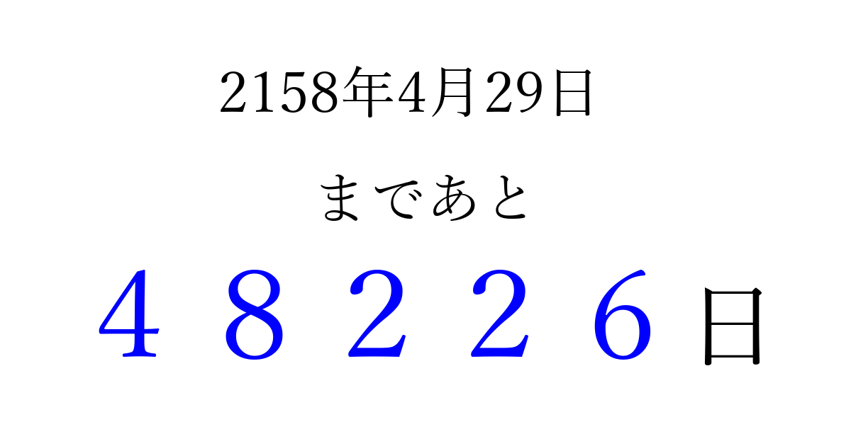 2158年4月29日(土)まで あと 99999 日です 追加すると、トップページからすぐ選べるようになります ※2026/04/15現在の結果です。 最新の状態に更新する ↓シェアして、タイムライン上にカウントダウンを表示しよう!↓ 📤 この結果を共有する Tweet シェア Threads Bluesky 別の日付でカウントダウン 2158年4月のカレンダー このページをブックマークに追加すると、いつでもカウントダウンを確認できます。 (PC: Ctrl+D / Mac: ⌘+D) hitome-notes.comでは以下のページも運営しています。 指定日と期間から日付を計算 | ガチャ確率計算・シミュレーション | プライバシー・ポリシー 運営者:Avocado