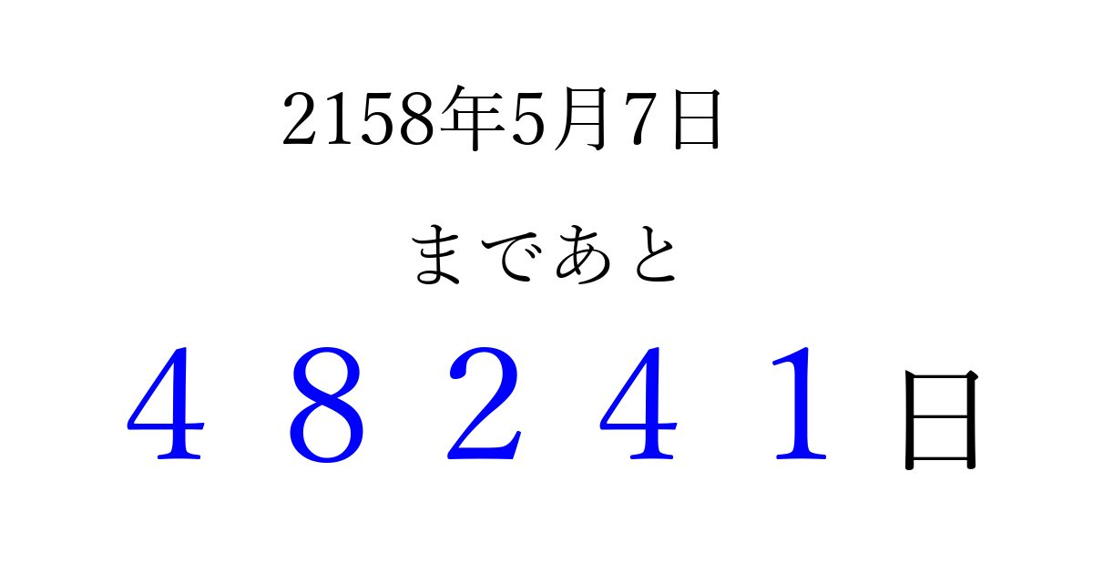2158年5月7日(日)まで あと 99999 日です 追加すると、トップページからすぐ選べるようになります ※2026/04/08現在の結果です。 最新の状態に更新する ↓シェアして、タイムライン上にカウントダウンを表示しよう!↓ 📤 この結果を共有する Tweet シェア Threads Bluesky 別の日付でカウントダウン 2158年5月のカレンダー このページをブックマークに追加すると、いつでもカウントダウンを確認できます。 (PC: Ctrl+D / Mac: ⌘+D) hitome-notes.comでは以下のページも運営しています。 指定日と期間から日付を計算 | ガチャ確率計算・シミュレーション | プライバシー・ポリシー 運営者:Avocado