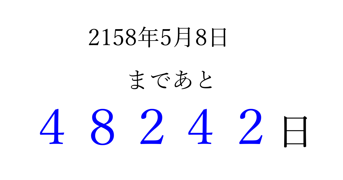 2158年5月8日(月)まで あと 99999 日です 追加すると、トップページからすぐ選べるようになります ※2026/04/08現在の結果です。 最新の状態に更新する ↓シェアして、タイムライン上にカウントダウンを表示しよう!↓ 📤 この結果を共有する Tweet シェア Threads Bluesky 別の日付でカウントダウン 2158年5月のカレンダー このページをブックマークに追加すると、いつでもカウントダウンを確認できます。 (PC: Ctrl+D / Mac: ⌘+D) hitome-notes.comでは以下のページも運営しています。 指定日と期間から日付を計算 | ガチャ確率計算・シミュレーション | プライバシー・ポリシー 運営者:Avocado