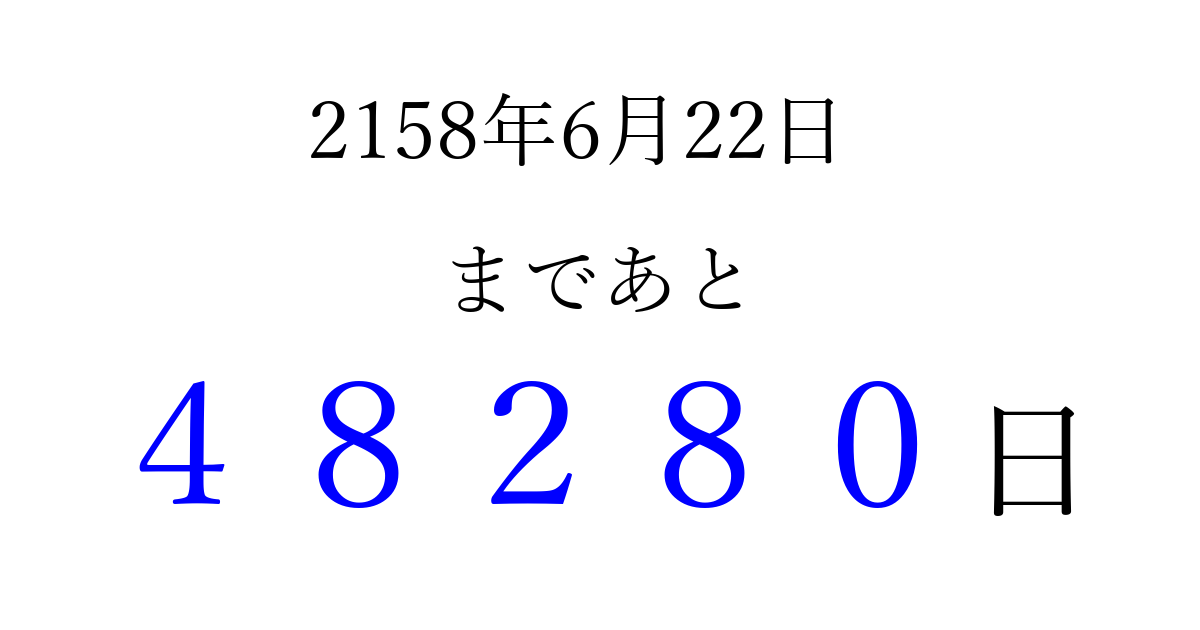 2158年6月22日(木)まで あと 99999 日です 追加すると、トップページからすぐ選べるようになります ※2026/04/15現在の結果です。 最新の状態に更新する ↓シェアして、タイムライン上にカウントダウンを表示しよう!↓ 📤 この結果を共有する Tweet シェア Threads Bluesky 別の日付でカウントダウン 2158年6月のカレンダー このページをブックマークに追加すると、いつでもカウントダウンを確認できます。 (PC: Ctrl+D / Mac: ⌘+D) hitome-notes.comでは以下のページも運営しています。 指定日と期間から日付を計算 | ガチャ確率計算・シミュレーション | プライバシー・ポリシー 運営者:Avocado