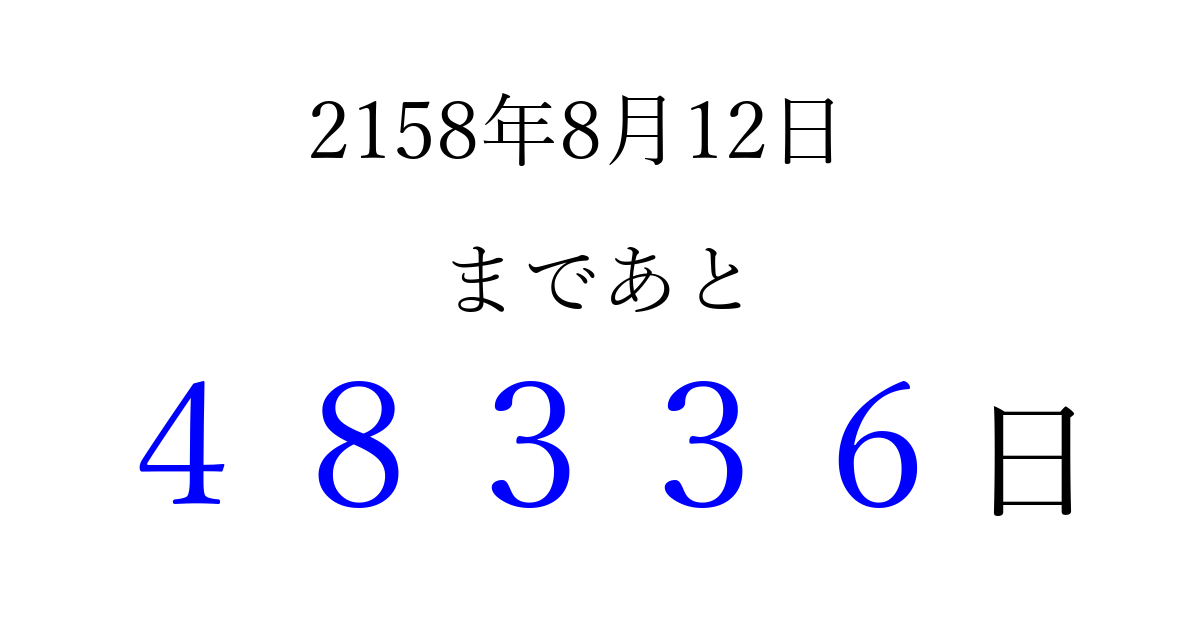 2158年8月12日(土)まで あと 99999 日です 追加すると、トップページからすぐ選べるようになります ※2026/04/10現在の結果です。 最新の状態に更新する ↓シェアして、タイムライン上にカウントダウンを表示しよう!↓ 📤 この結果を共有する Tweet シェア Threads Bluesky 別の日付でカウントダウン 2158年8月のカレンダー このページをブックマークに追加すると、いつでもカウントダウンを確認できます。 (PC: Ctrl+D / Mac: ⌘+D) hitome-notes.comでは以下のページも運営しています。 指定日と期間から日付を計算 | ガチャ確率計算・シミュレーション | プライバシー・ポリシー 運営者:Avocado